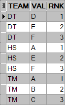 , RANK() OVER(PARTITION BY TEAM ORDER BY VAL) AS RNK